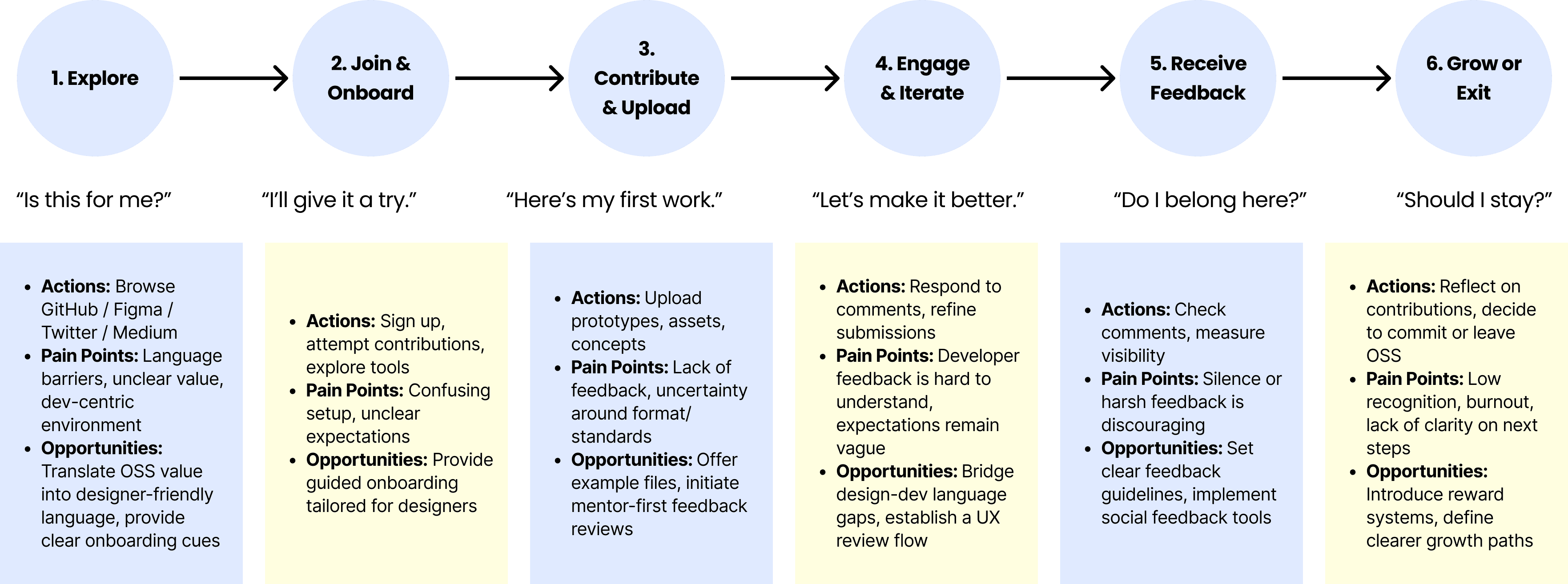 Designers currently face barriers such as unclear entry pathways, feeling intimidated by developer heavy platforms and lack of visibility on open source projects.