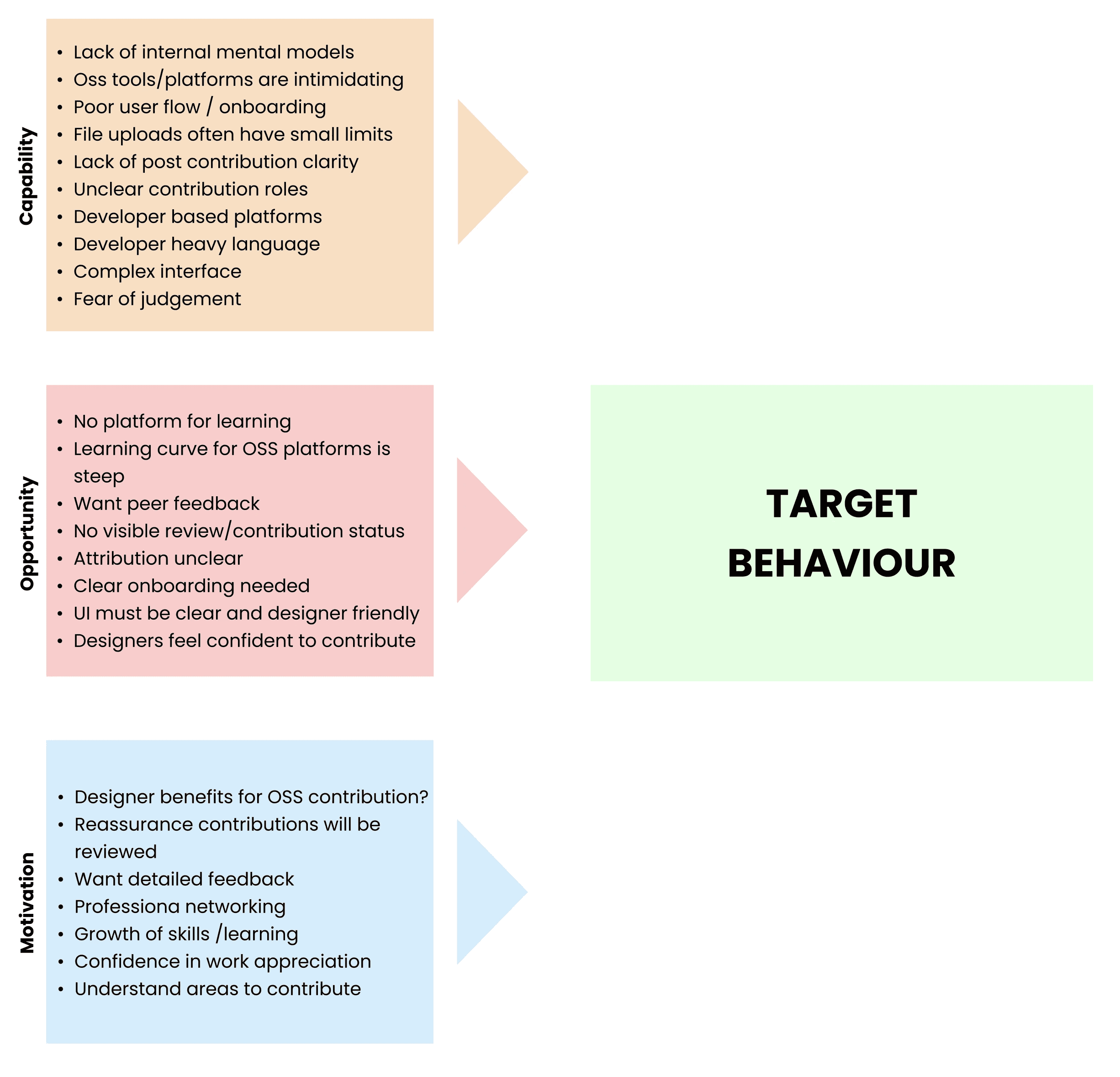 Used the COM-B model to identify pain points and obstacles for users to engage with OSS platforms currently, and where there are opportunities for our service/product.