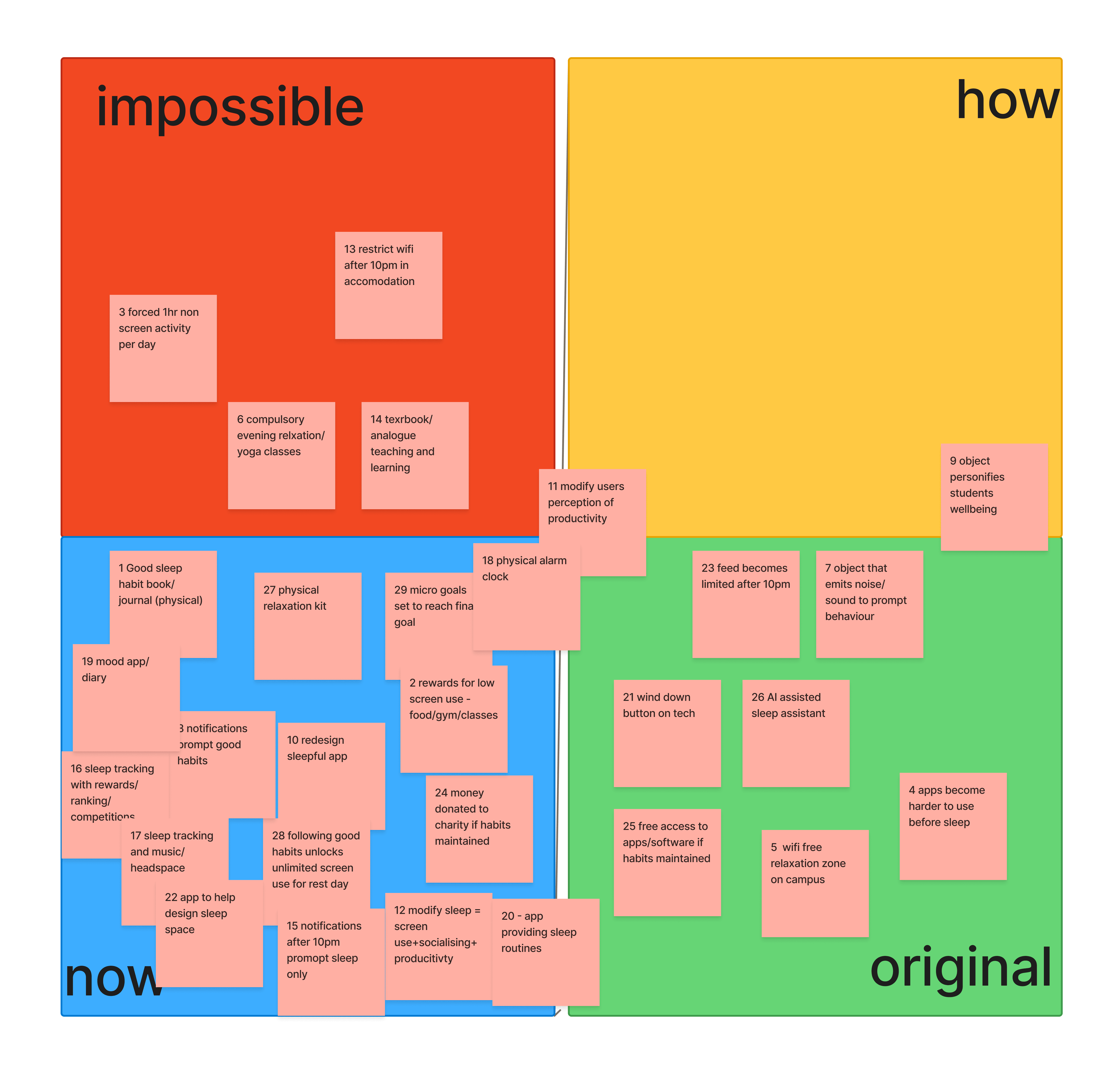 Using matrices, I narrows down the key ideas and then used Dot voting with key users to identify the ideas of interest.