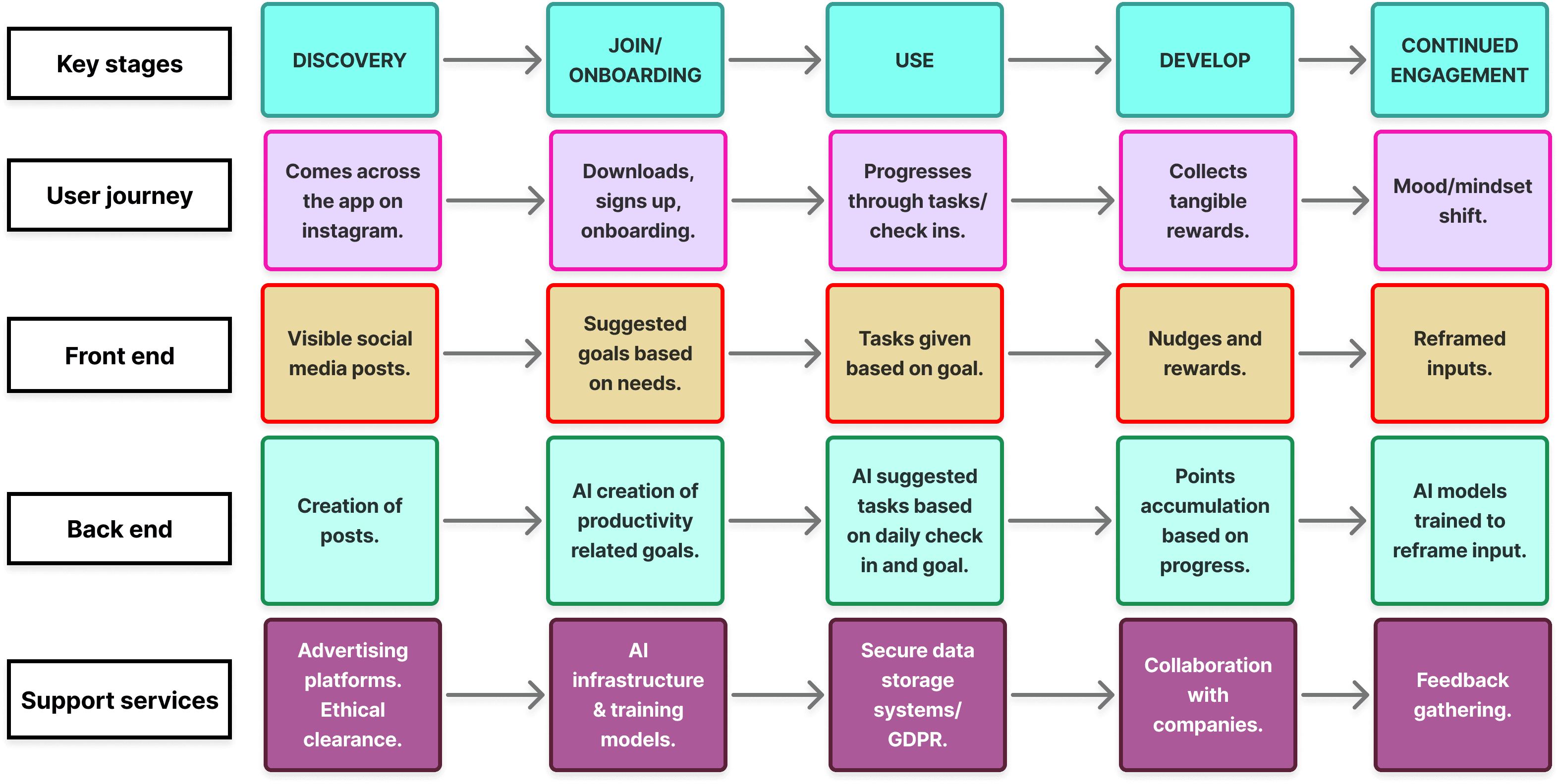 Creating a new customer journey based on discovery, use and engagement of the product, I created this service blueprint. Identifying the front end, back end and support services needed helped to determined feasibility of the concept.