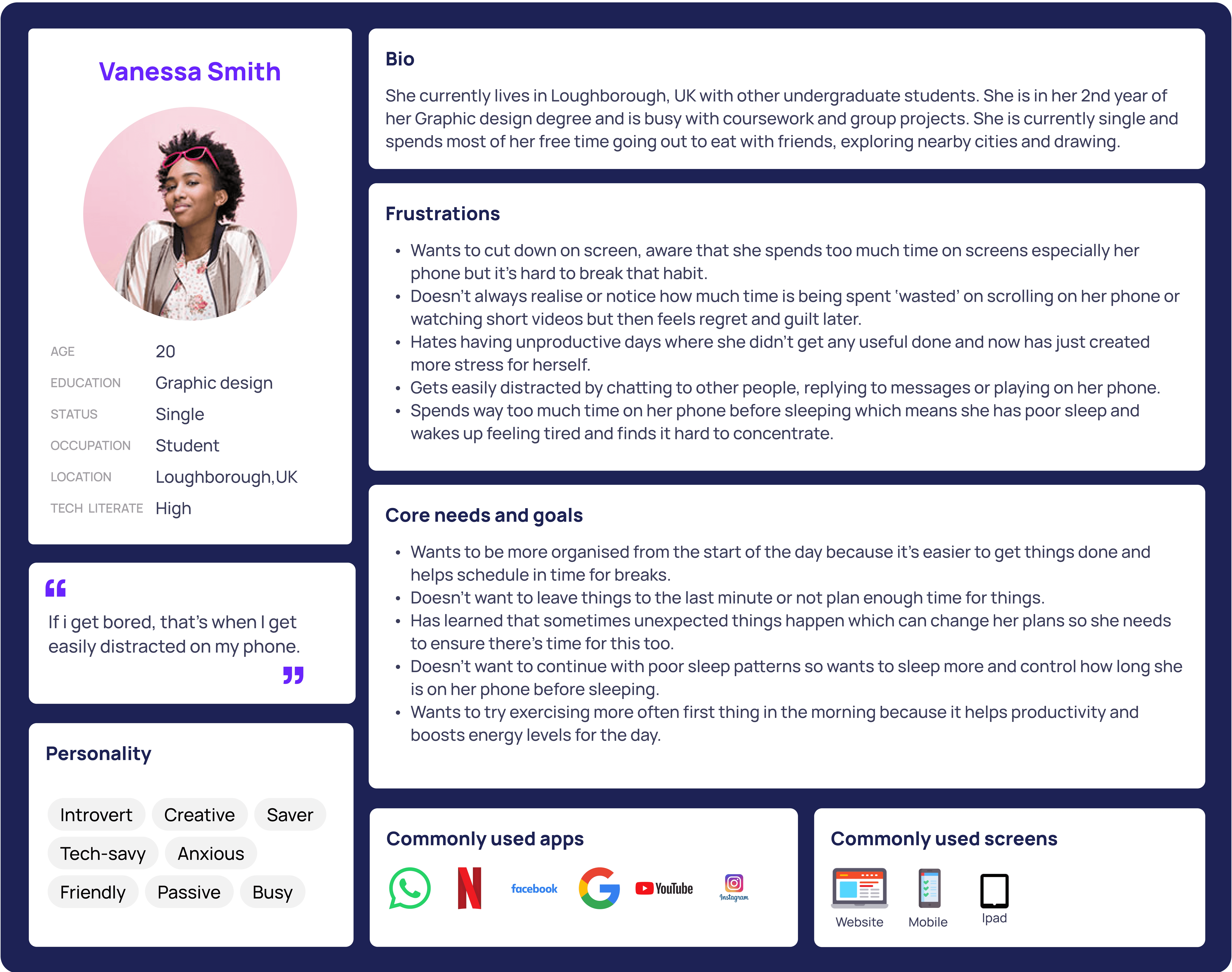 I developed an app which helps students to choose, set and work towards habits that help to improve productivity. The design of the app is built on multiple behaviour change theories to not only shift behaviour long term, but to create a more positive mindset and user mental model.